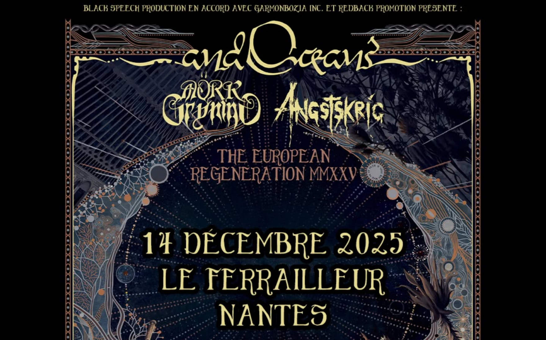 Préparez-vous à une immersion totale dans le chaos cosmique : ...And Oceans débarque sur scène pour une nuit de furie glaciale et de beauté noire. Emmené par Mathias "Vreth" Lillmåns, voix emblématique de Finntroll, le groupe fusionne black metal symphonique, pulsations industrielles et atmosphères abyssales dans un show aussi intense qu’hypnotique.